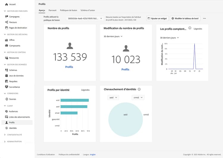 Profil client en temps réel : intégrez les attributs et les événements clients provenant de sources en ligne, hors ligne et pseudonymes dans un profil unique et unifié.Utilisez le profil pour impliquer les clientes et clients avec des expériences personnalisées en temps réel sur plusieurs points de contact.