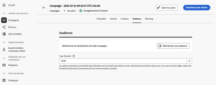 Un seul type d’identité est autorisé par campagne. Les personnes appartenant à un segment qui ne dispose pas du type d’identité sélectionné parmi leurs différentes identités ne seront pas ciblées par la campagne. Pour en savoir plus sur les types d’identité et les espaces de noms, consultez la documentation d’Adobe Experience Platform.