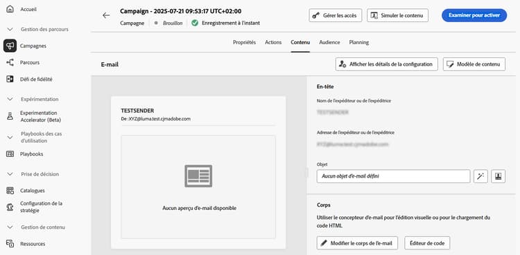 Une fois votre contenu défini, utilisez le bouton Simuler le contenu pour prévisualiser et tester votre contenu avec des profils de test ou des exemples de données d’entrée chargés à partir d’un fichier CSV/JSON ou ajoutés manuellement. Découvrez comment prévisualiser et tester du contenu.