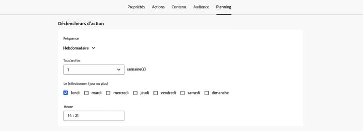 Pour les actions E-mail, SMS et notification push, vous pouvez définir la fréquence d’envoi du message de la campagne. Pour ce faire, utilisez l’option Déclencheurs d’action dans l’écran de création de la campagne pour indiquer si la campagne doit être exécutée tous les jours, toutes les semaines ou tous les mois.
