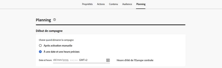 Si vous ne souhaitez pas exécuter votre campagne juste après son activation, vous pouvez spécifier la date et l’heure auxquelles le message doit être envoyé dans la section Début de campagne.