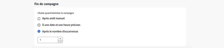 La section Fin de la campagne vous permet de spécifier le moment où une campagne doit cesser d’être exécutée. En dehors des dates spécifiées, la campagne ne sera pas exécutée.