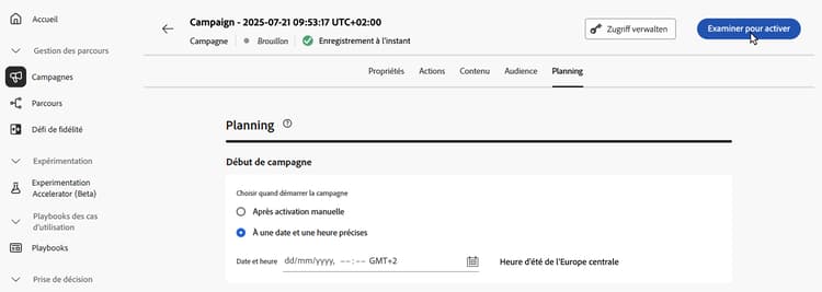 La campagne est activée. Son statut est soit Actif, soit Planifié si vous avez saisi une date de début. Le message configuré dans la campagne est envoyé immédiatement ou à la date indiquée.