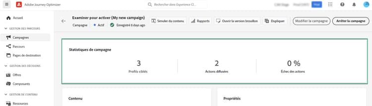 Une fois qu’une campagne a été activée, vous pouvez vérifier à tout moment ses informations en l’ouvrant. Le résumé vous permet d’obtenir des statistiques sur le nombre de profils ciblés et les actions diffusées et en échec.