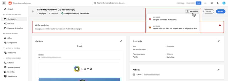 En cas d’erreur, vous ne pouvez pas activer la campagne. Résolvez les erreurs avant de continuer.