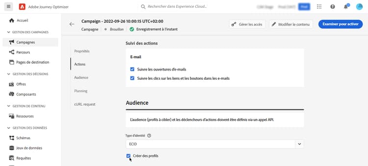 Pour activer la création des profils lors de l’exécution de la campagne, activez l’option Créer de nouveaux profils. Si cette option est désactivée, les profils inconnus sont refusés pour tout envoi et l’appel API échoue.