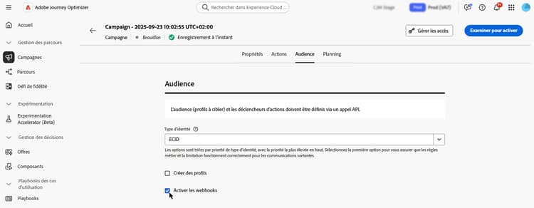 Pour les campagnes transactionnelles déclenchées par API, vous pouvez permettre aux webhooks de recevoir des commentaires en temps réel sur le statut d’exécution de vos messages. Pour ce faire, activez/désactivez l’option Activer les webhooks pour envoyer les événements de statut de diffusion à un webhook configuré.
