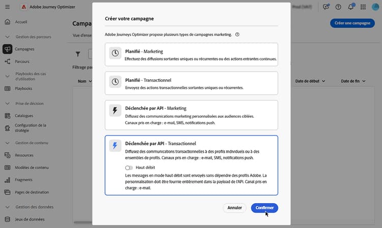 accordion Mode de débit élevé Pour les campagnes transactionnelles déclenchées par API, vous pouvez activer le mode de débit élevé. Ce mode est conçu pour la messagerie en temps réel à grande échelle (jusqu’à 5 000 transactions par seconde) et offre une disponibilité supérieure avec une latence plus faible. En savoir plus l’utilisation du mode de débit élevé