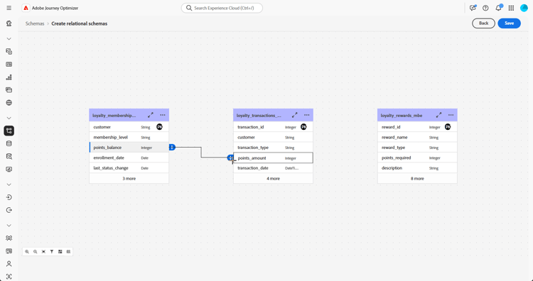 Définissez le modèle de données basé sur un modèle, requis pour les campagnes orchestrées en créant des schémas tels que Membres du programme de fidélité, Transactions de fidélité et Récompenses de fidélité. Chaque schéma doit inclure une clé primaire, un attribut de contrôle de version et des relations appropriées pour référencer des entités telles que les Destinataires ou les Marques.