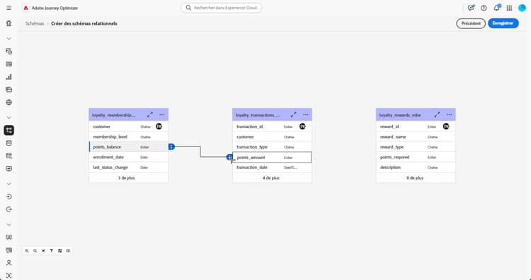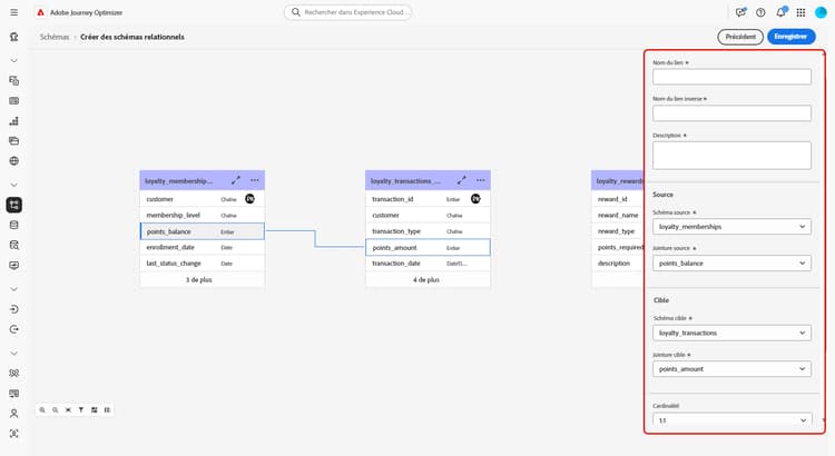 Établissez une relation entre le schéma Transactions de fidélité et le schéma Destinataires pour associer chaque transaction à l’enregistrement client correct.
