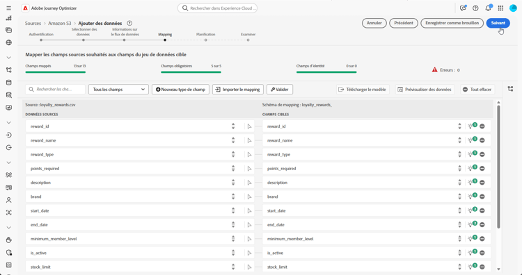 Dans la fenêtre Mappage, vérifiez que chaque attribut de fichier source est correctement mappé avec les champs correspondants dans le schéma cible. Découvrez les dimensions de ciblage.