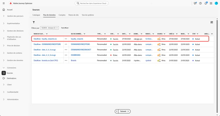Dans le menu Connexions, sélectionnez Sources et accédez à l’onglet Flux de données pour suivre l’exécution du flux, vérifier les enregistrements ingérés et résoudre les erreurs.