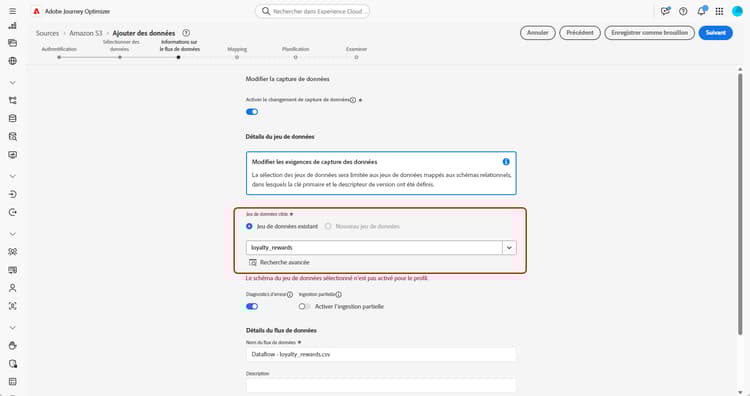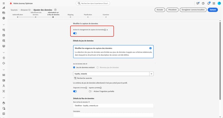 Depuis la page Détails du jeu de données, cochez Activer la capture des données modifiées pour afficher uniquement les jeux de données mappés à des schémas basés sur des modèles et contenant à la fois une clé primaire et un descripteur de version.