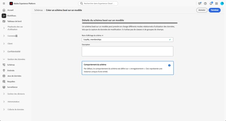 Commencez par créer manuellement un nouveau schéma basé sur un modèle dans Adobe Experience Platform. Ce processus vous permet de définir la structure du schéma à partir de zéro, y compris son nom et son comportement.