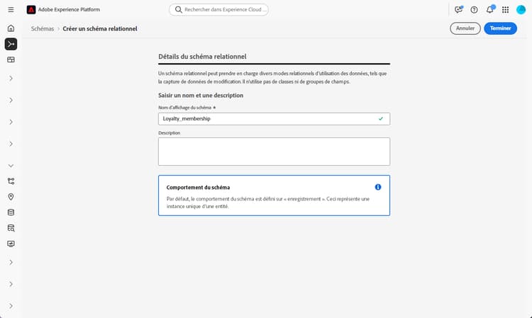 Création manuelle d’un schéma relationnel à l’aide de l’interface Adobe Experience Platform.