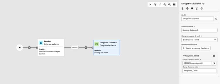 L’exemple suivant montre comment créer une audience simple à l’aide du ciblage. Une requête identifie tous les destinataires et toutes les destinatrices qui ont réservé un voyage au cours des 30 derniers jours en filtrant cette population dans votre campagne orchestrée. En choisissant Destinataires - CRMID comme dimension de ciblage, l’audience cible chaque événement de réservation individuel plutôt que le ou la destinataire dans son ensemble. L’activité Enregistrer l’audience capture ensuite ces profils afin de créer une audience réutilisable des acheteurs et acheteuses récents.