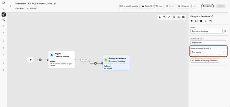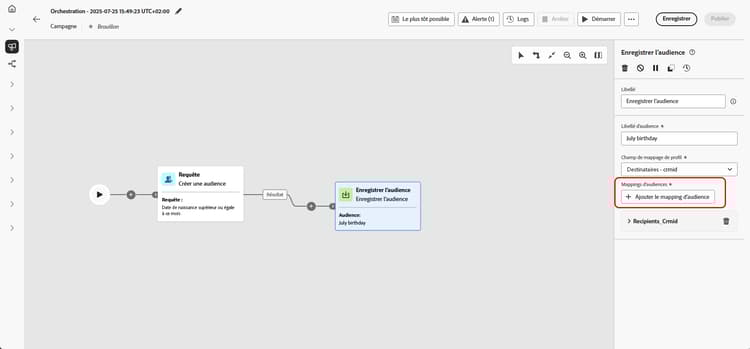 Finalisez votre configuration en enregistrant et en publiant la campagne orchestrée. Cette opération génère et stocke votre audience.