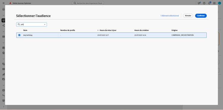 Le contenu de l’audience enregistrée est ensuite disponible dans la vue détaillée de l’audience, accessible depuis le menu Audiences, ou sélectionnable lors du ciblage d’une audience, par exemple avec une activité Lecture d’audience.