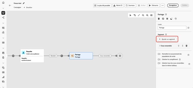 Le volet de configuration des activités s’ouvre avec un sous-ensemble par défaut. Cliquez sur le bouton Ajouter un segment pour ajouter autant de sous-ensembles que vous le souhaitez pour segmenter la population entrante.