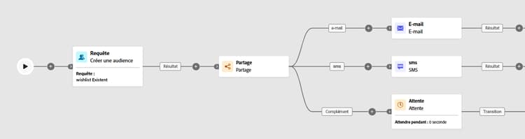 Dans l’exemple suivant, l’activité Partage sert à segmenter une audience en sous-ensembles distincts en fonction du canal de communication que nous voulons utiliser :
