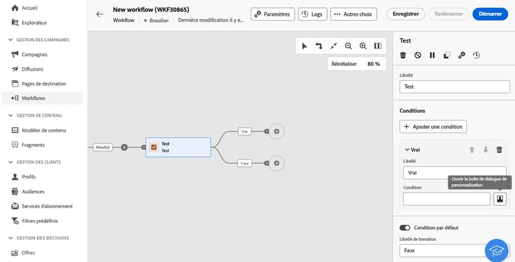 Pour configurer la condition associée à une transition, cliquez sur l’icône Ouvrir la boîte de dialogue de personnalisation. Utilisez l’éditeur d’expression pour définir les règles d’activation de cette transition. Vous pouvez également utiliser des variables d’événement, des conditions et des fonctions de date/heure.