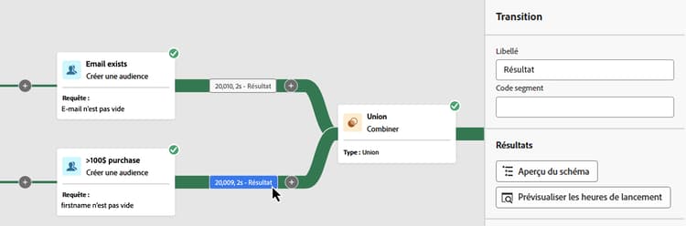 Lors de l’exécution (en mode test ou actif), le flux visuel montre le déplacement des profils dans le parcours en temps réel. Le nombre de profils qui passent d’une tâche à l’autre est affiché.