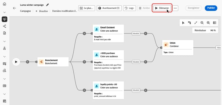 Journey Optimizer vous permet de tester les campagnes orchestrées avant leur mise en ligne. Lorsqu’une campagne est créée, elle passe par défaut à l’état Brouillon. Dans cet état, vous pouvez exécuter la campagne manuellement pour tester le flux.
