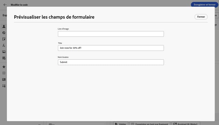 Vous pourrez facilement modifier les champs de formulaire d’un parcours ou d’une campagne d’expérience basée sur du code, sans ouvrir l’éditeur de personnalisation.