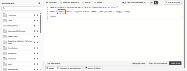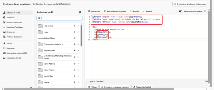 Pour plus de flexibilité et de contrôle sur les expériences basées sur du code, Journey Optimizer permet à votre équipe de développement de créer des modèles de contenu JSON ou HTML contenant des champs modifiables prédéfinis spécifiques.