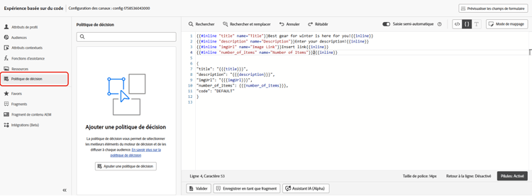 Dans les expériences basées sur du code, vous pouvez utiliser la fonctionnalité de prise de décision. Sélectionnez l’icône Politique de décision dans la barre de gauche, puis cliquez sur Ajouter une politique de décision. En savoir plus