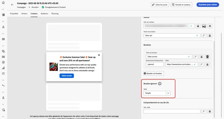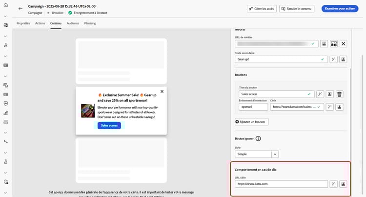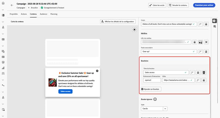 Dans le champ Cible, saisissez l’URL web ou le lien profond vers lequel les utilisateurs et utilisatrices seront redirigés après avoir interagi avec le bouton.