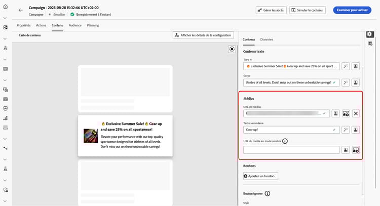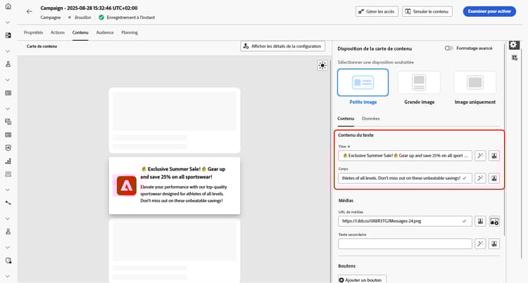 Dans l’onglet Contenu, vous pouvez personnaliser vos cartes de contenu en définissant le contenu et en ajoutant des médias et des boutons d’action directement à partir de cet onglet.