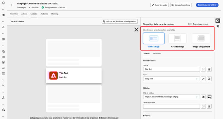 Dans la section Disposition de la carte de contenu, choisissez l’une des trois options de disposition d’image en fonction de vos besoins en matière de messages.
