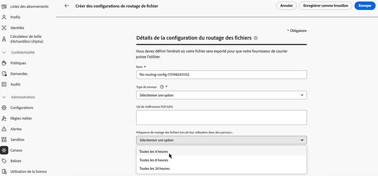 Accédez au menu Administration > Canaux > Paramètres du publipostage direct > Routage des fichiers, puis cliquez sur Créer une configuration de routage de fichiers.