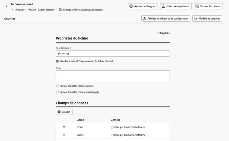Pour ce faire, cliquez sur Simuler le contenu, puis ajoutez un profil de test pour vérifier le rendu du fichier d’extraction à l’aide des données du profil de test. Vous trouverez des informations détaillées sur la sélection des profils de test et la prévisualisation de votre contenu dans la section Gestion de contenu.