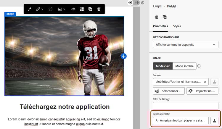 Le Journey Optimizer Concepteur d’e-mail, qui permet aux spécialistes marketing de créer du contenu pour les e-mails et les pages de destination, vous permet de respecter facilement cette directive, en se basant sur les règles WCAG 2.1, niveau AA.