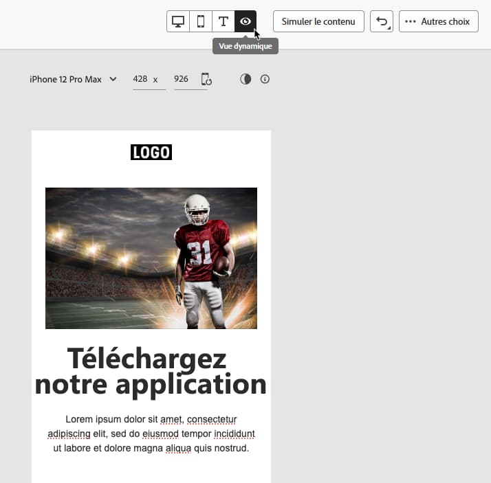 De plus, le Concepteur d’e-mail Journey Optimizer vous permet de prévisualiser et d’optimiser la conception pour différents appareils et tailles d’écran. Vous pouvez à tout moment Passer à la vue dynamique afin de vérifier que votre contenu s’affiche correctement sur les différents appareils.