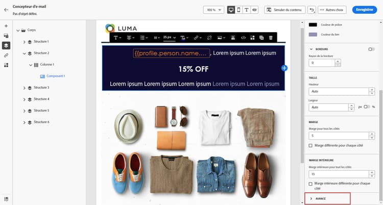 Dans l’interface du concepteur d’e-mail, lorsque vous sélectionnez un élément et en affichez les paramètres dans le panneau latéral, vous pouvez personnaliser les attributs intégrés et leur valeur pour cet élément spécifique.