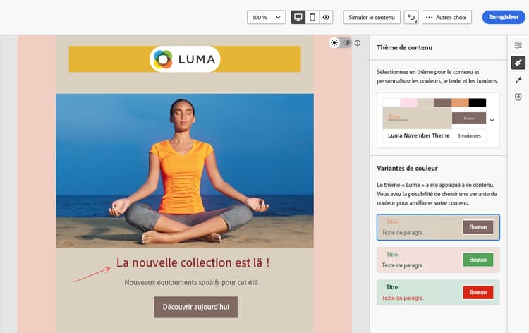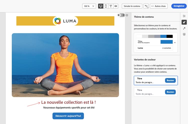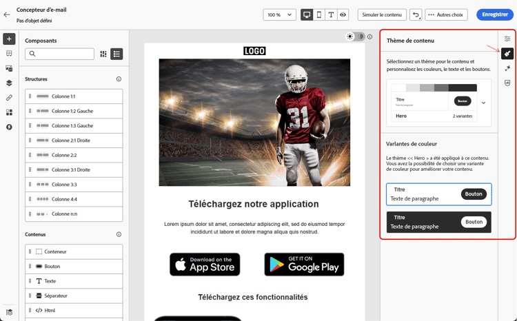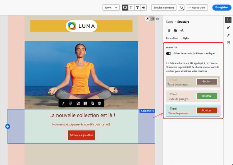 Cliquez en dehors de la liste déroulante. Le thème personnalisé nouvellement sélectionné applique automatiquement ses styles à tous les composants d’e-mail. Vous pouvez basculer entre les variantes de couleur, le cas échéant.