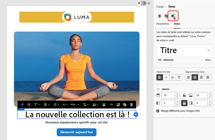 Cette fonctionnalité permet aux spécialistes du marketing d’utiliser plus rapidement et à moindre effort des e-mails visuellement attrayants et conformes à la marque, tout en fournissant des options de personnalisation avancées pour des besoins de conception uniques.