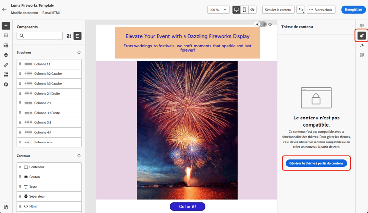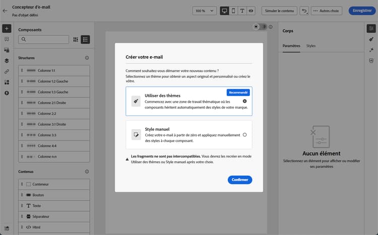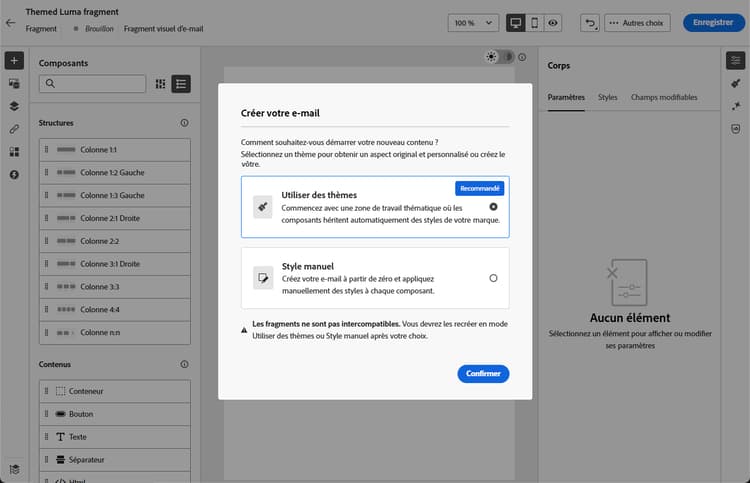 Pour exploiter un fragment dans un modèle ou un e-mail avec des thèmes appliqués, ce fragment doit avoir été créé lui-même à l’aide de thèmes. Sinon, vous ne pourrez pas utiliser ce fragment dans votre contenu avec thème.