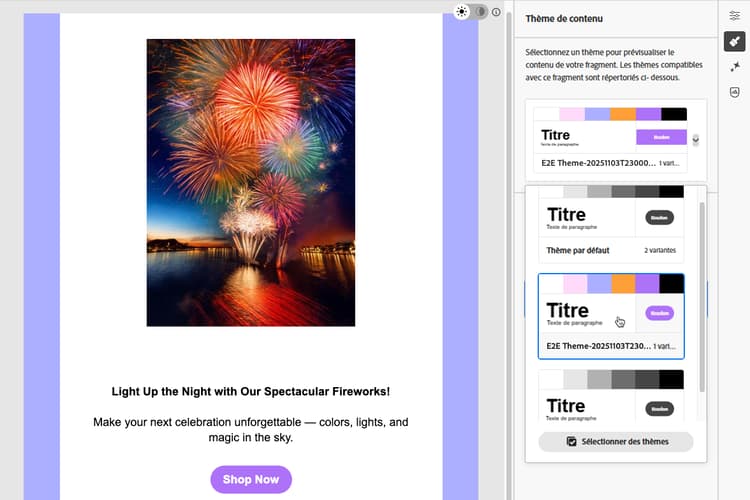 Vous pouvez sélectionner d’autres thèmes pour prévisualiser le contenu de votre fragment. Pour ce faire, sélectionnez la flèche en regard du thème par défaut, puis cliquez sur Sélectionner des thèmes.
