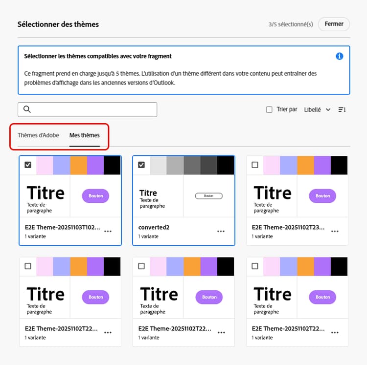 Vous pouvez naviguer entre les onglets Thèmes Adobe et Mes thèmes et sélectionner jusqu’à cinq thèmes compatibles (dans les deux onglets) pour votre fragment.