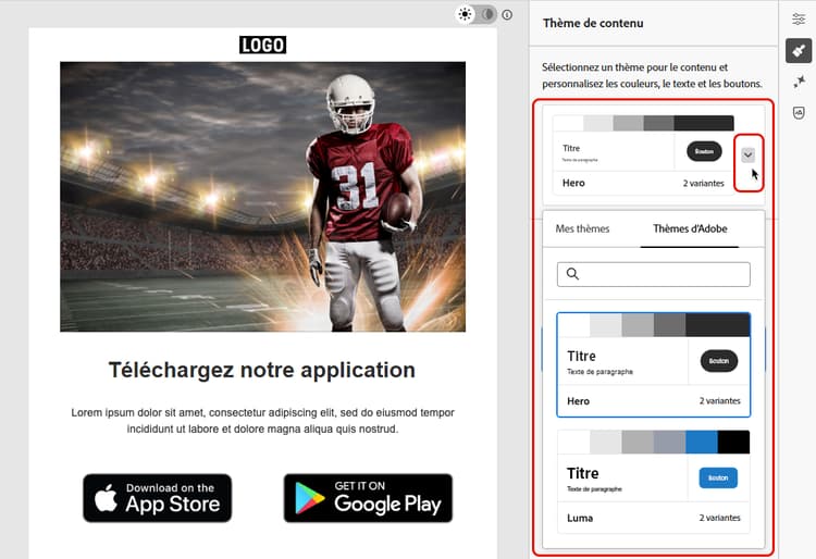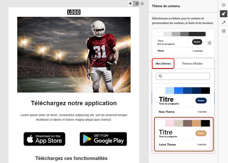 Pour appliquer des thèmes de style par défaut ou personnalisés à un modèle de contenu ou à un e-mail, procédez comme suit.