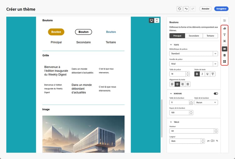 Grâce aux thèmes, les utilisateurs et les utilisatrices non techniques ont la possibilité de créer du contenu réutilisable adapté à une marque et une langue de conception spécifiques en ajoutant un style personnalisé aux modèles standard.