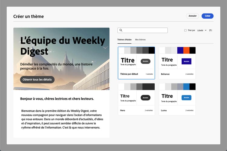 Sélectionnez un thème Adobe. Dans cet exemple, sélectionnez le Thème par défaut et cliquez sur Créer.