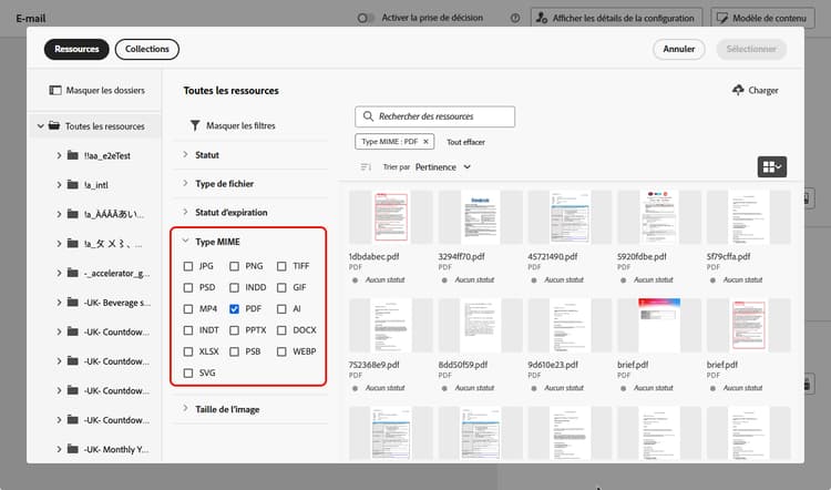 Utilisez le filtre PDF de la section Type MIME pour limiter la sélection au format de fichier approprié.