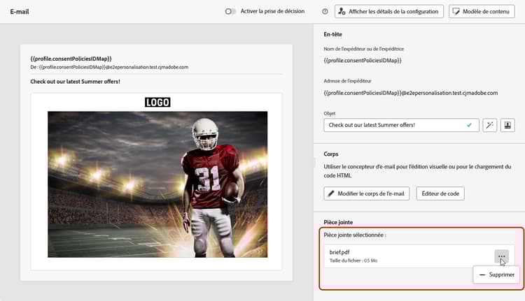 Vous pouvez joindre un fichier PDF statique aux e-mails que vous envoyez avec Journey Optimizer.