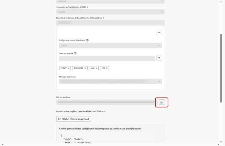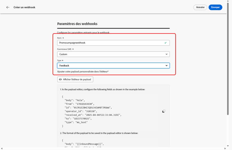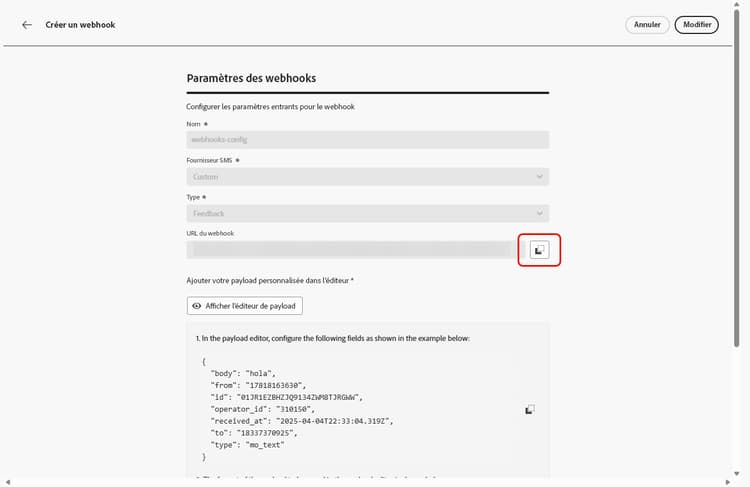 Configurez vos paramètres de webhook comme indiqué ci-dessous :