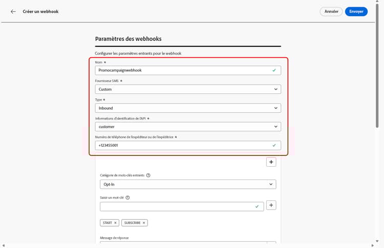 Après avoir créé et configuré les paramètres entrants pour le webhook, vous devez créer une configuration des canaux pour les messages SMS.